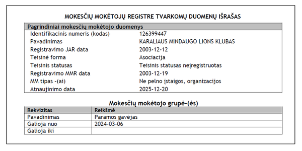 Gavėjo laukelyje įrašykite Vilniaus Karaliaus Mindaugo Lions klubo identifikacinį kodą – 126399447